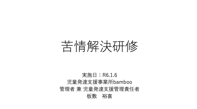 苦情解決研修の実施報告 未分類 X Facebook はてブ LINE コピー 2024.01.062024.03.06 昨日は、苦情対応窓口(担当者・責任者)主導にて、苦情解決に関する社内研修を実施しました。 ※本研修については、「福祉サービス苦情解決研修会(上級編)」を参考にしながら実施しています。 実施内容は以下の通りです。 リスク管理について 事故発生のメカニズムについて 事故発生時の基本対応について 苦情・クレーム等への対応とマニュアル管理について 引き続き、大きな事故や怪我等に注意しながら支援を実施させていただきます。