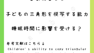 未分類 子どもの三角形を模写する能力は睡眠時間に影響を受ける? 今回は「子どもの三角形を模写する能力。睡眠時間に影響を受ける?」というテーマでの内容になります。主な参考文献はこちら↓。chidren's ability to copy triangular figures is affected by ... 2025.11.20 未分類