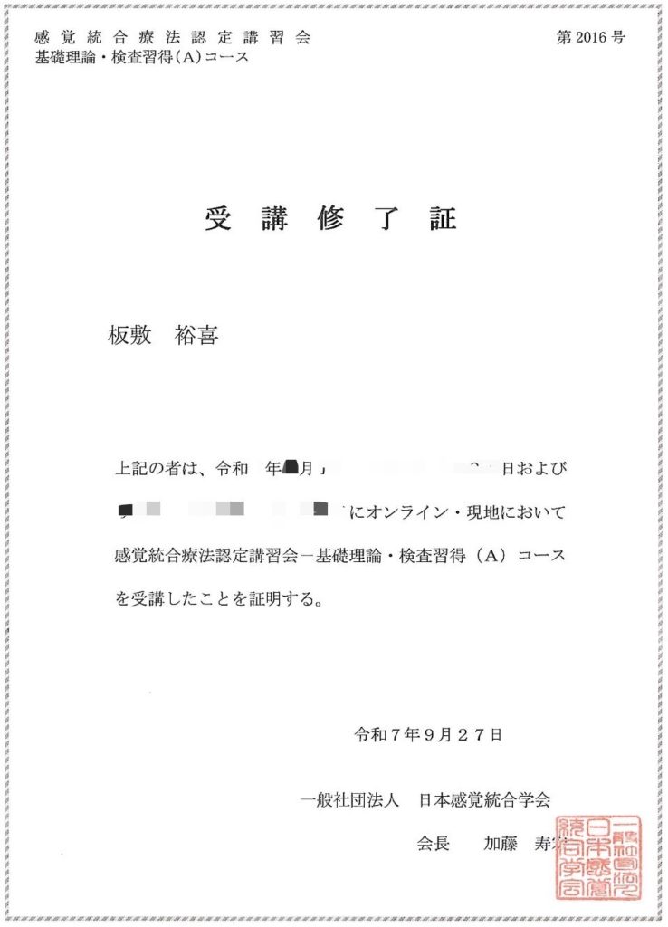 この度、日本感覚統合学会の認定講習会にて、基礎・検査習得コースの修了証を頂きました!