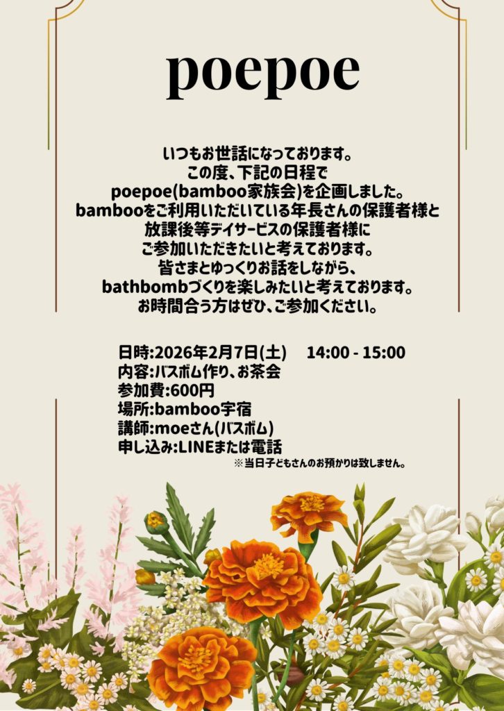 家族会名称の「poepoe」は、ハワイ語で、人(poe)と人(poe)が会って丸く調和するという意味で、保護者の方が気軽に集まられる場になればとの想いでつけられています。